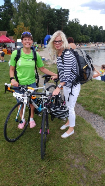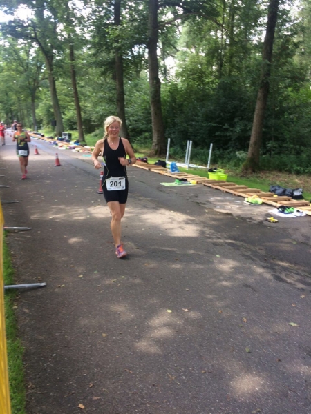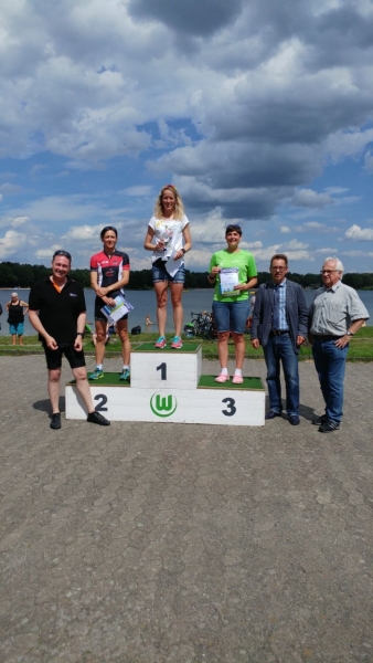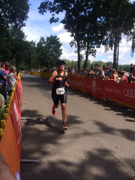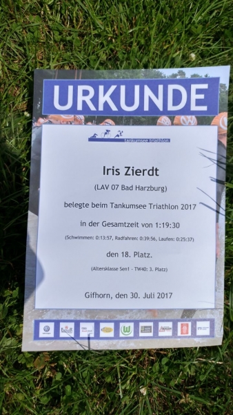 Iris startete als Erste von den Dreien und konnte ca. im Mittelfeld nach knapp 700 m das Wasser verlassen und sich auf den Weg zur Wechselzone machen. Auf dem Rad angekommen, konnte man wirklich Druck machen. Die Radstrecke war eine absolute Sprintstrecke und ohne Höhenmeter. Es musste ungefähr 10 km in eine Richtung gefahren, dann eine Kehrtwende von 180 Grad umfahren und wieder zur Wechselzone zurück gefahren werden. Auf der Rückstrecke war sehr starker Gegenwind und es kostete den Athleten wirklich sehr viel Kraft. Iris schaffte es aber viele Frauen, die vor ihr aus dem Wasser gekommen waren zu überholen und konnte als 9. ihrer Startgruppe auf die Laufstrecke gehen. Sie lief ein sehr konstantes Tempo bis zum Ziel und überquerte nach 1.19.30 Std. glücklich und geschafft die Ziellinie. In ihrer Altersklasse holte sie sich damit den 3. Platz.