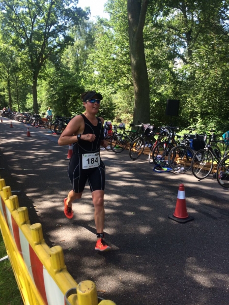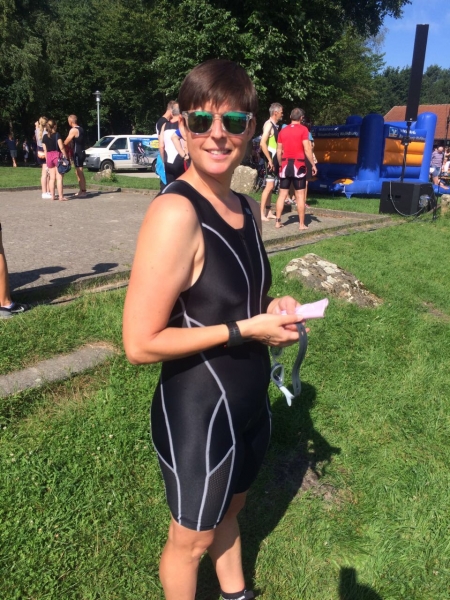 Andrea startete in der 2. Frauengruppe und war froh, trotz des Brustschwimmens in einer ordentlichen Zeit auf die Radstrecke gehen zu können. Hier holte auch sie Frau um Frau auf und ging dann positiv gestärkt auf die Laufstrecke. Sie kam sehr freudig nach 1.30.19 Std. ins Ziel und war über ihr Ergebnis mehr als zufrieden.