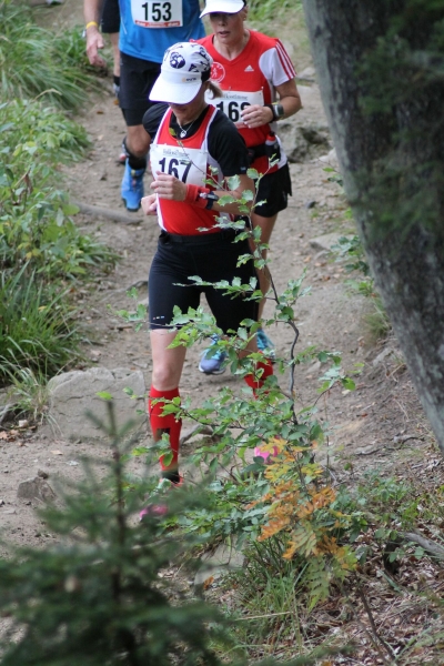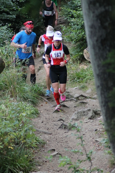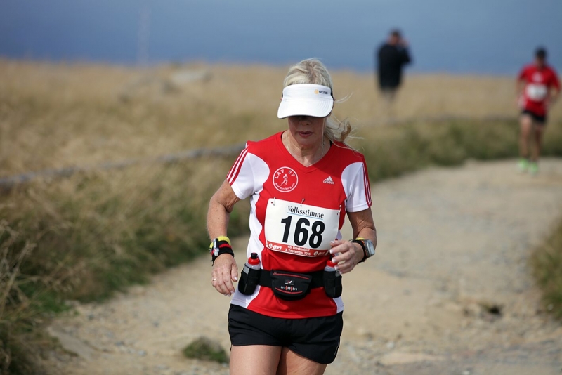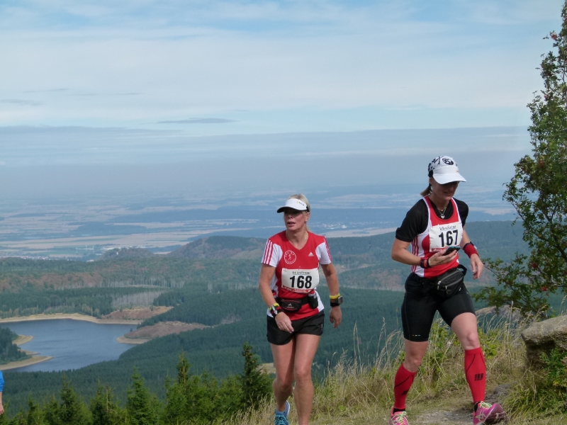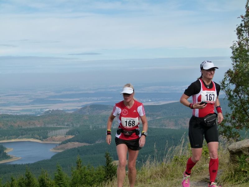 Bei nahezu perfektem Läuferwetter, fiel der Startschuss für den Brockenlauf pünktlich um 09:45 Uhr. In diesem Jahr wollten Sabine Krumpen-Müller und Andrea Bittner wieder gemeinsam den Brocken bezwingen und in Ilsenburg die 26,2 km laufen. Diesmal gesellte sich auch Iris Zierdt dazu, um die lange Distanz in Angriff zu nehmen. Fleißig, im Training einige Male die Überdistanz gelaufen, war es dann soweit. Sabine und Andrea wollten wieder zusammen laufen und Sabine den Pacemaker für Andrea spielen. Denn die Zeit von 2014 galt es zu knacken. Iris als Ersttäterin wollte einfach die Strecke in einer für sie vernünftigen Zeit schaffen. In diesem Jahr war die Streckenführung ein wenig anders. Nach ca. 4,5km führte die Laufstrecke über den Bremer Weg. Einem Singletrail, der 1km an einem Abhang entlang führte. Steinig, verwurzelt und sehr gefährlich, wurde die Strecke zum Teil durch die Feuerwehr abgesichert zum Teil durch Personal und Stahlseilen zum festhalten. Nachdem das geschafft war, ging es nur noch berghoch bis zum Brocken.