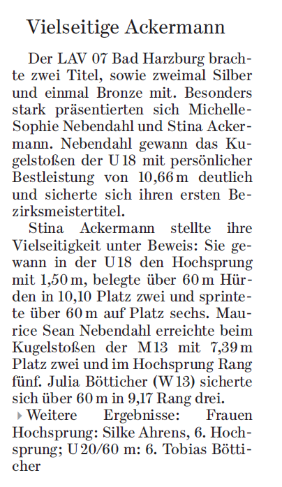 regionalsport & GZ vom 17.02.2018: Bezirksmeisterschaften 17.02.2018 und noch etwas ausführlicher: LAV-Leichtathletikteams bei Bezirksmeisterschaft erfolgreich 2018-02-17 Melanie Lehmann Teilen !