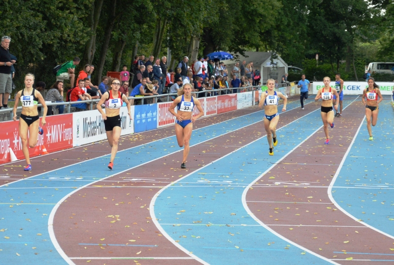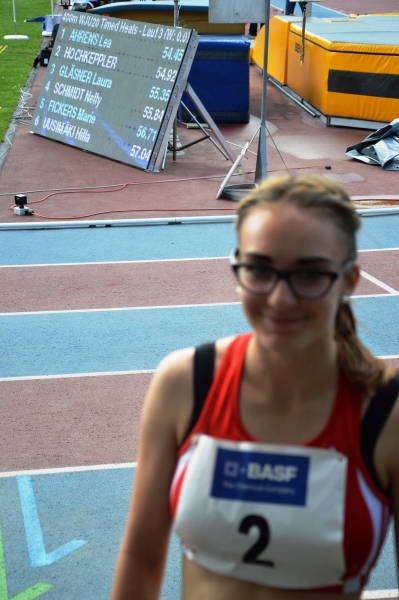Das Rennen selbst verlief nahezu optimal. Nach einem etwas schwächeren Start drückte Lea auf der Gegengerade aufs Tempo und lief sehr diszipliniert die ersten 200m an. Sie wurde dann Ende der Gegengeraden von der zwei Jahre älteren Laura Gläsner aus Helmstedt attackiert. Doch in der Kurve hielt sie toll dagegen und konnte trotz längeren Laufweges den Angriff abwehren. Im Übergang auf die Zielgeraden setzte sich die LAV-Kaderathletin dann ab und gewann ihren Lauf in ganz starken 54,45 Sekunden. In der Gesamtwertung aller drei Läufe belegte sie als jüngste Teilnehmerin im Feld Platz 6 von 17 Starterinnen. Mit ihrer Laufleistung war sie damit in Mannheim die zweitbeste deutsche Athletin, wohl gemerkt eine Altersklasse höher.