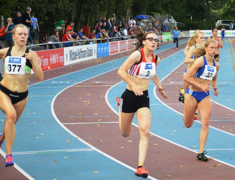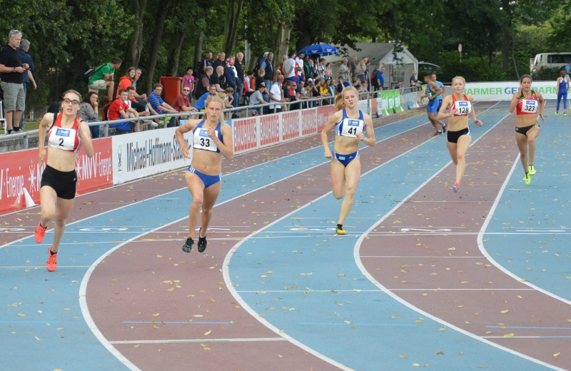 2-4: Bilder vom 400m Rennen eingangs der Zielkurve: das niedersächsische Duell zwischen Lea Ahrens (Bahn 5, Nr. 2, LAV 07 Bad Harzburg) und Laura Gläsner (Bahn 4, 33, SV Germania Helmstedt) , das Lea ausgangs der Kurve für sich entscheidet.