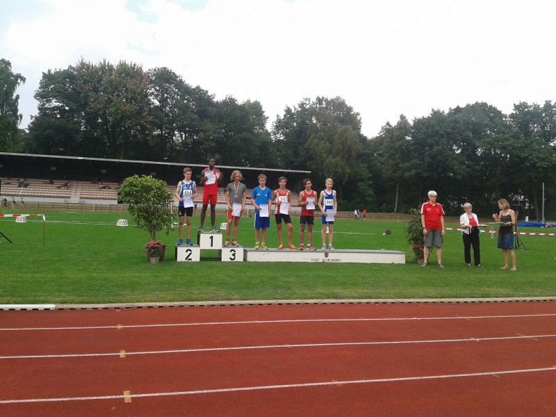 Seinen ersten Start bei Landesmeisterschaften hatte der 14-jährige Tom Korngiebel, ebenfalls vom LAV 07 Bad Harzburg. Über die Hundert Meter mit 27 Teilnehmern erreichte er mit persönlicher Bestzeit von 12:37 Sekunden das Finale und belegte hier mit 12:56 Sekunden einen sehr guten 6. Platz.