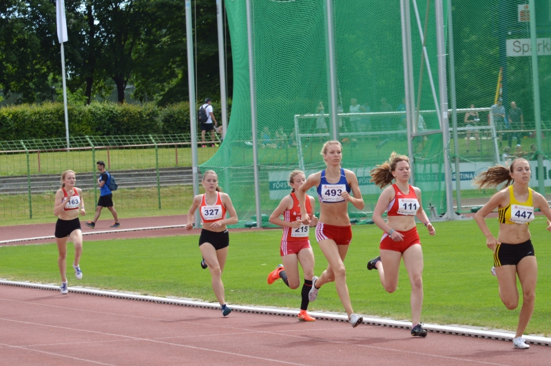 Am Sonntagnachmittag startete Stina Ackermann (eigentlich noch der Altersklasse WU16 angehörend) über 800m in der WU18. Bei warmer (28 Grad) und windiger Witterung kam sie leider nicht richtig in das Rennen rein und belegte in 2:27,40 Min. Platz 15. Viel stärker präsentierte sich Stina Ackermann am Freitagabend über 800m in der WU18 beim internationalen VOBA-Meeting in Osterode. Dort kontrollierte sie ihren Zeitlauf in der Spitzengruppe und zog 200m vor dem Ziel ihren Schlusssport an. Mit 2:25, 83 Min. belegte sie damit einen guten 5. Platz.